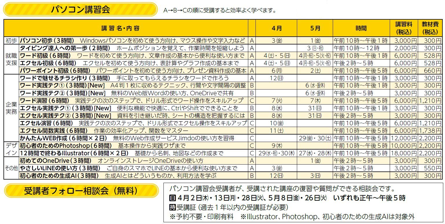 就業・起業・企業支援の定期講習会をパソコンステーションにて実施しています。